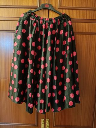 falda negra de lunaritos ,con volantitos ,cinturilla negra con cremallera por detrás,tiene más dobladillo por si se quiere más larga medidas :cintura:47,largo:37
