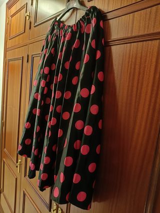 Preciosa falda de flamenca, ideal para cualquier evento. Es de color negro con lunares rosas. - Diseño elegante y favorecedor. - Confeccionada con una tela suave y de caída fluida. - Perfecta para lucir en cualquier ocasión.