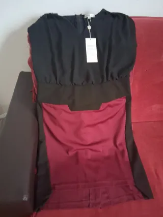 Elegante vestido bicolor con un diseño moderno. Sin estrenar - Parte superior negra con detalles. - Falda en tono burdeos. - Corte asimétrico en el bajo.