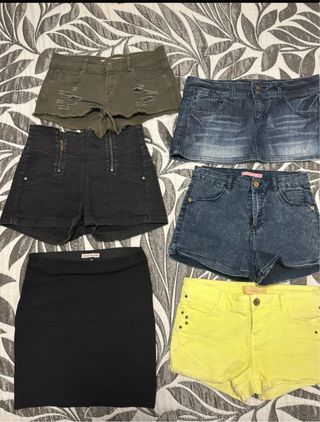 Conjunto de cinco shorts y una falda. Las prendas están en buen estado. - Incluye cinco shorts y una falda. - Colores: negro, azul y verde. - Talla M.