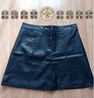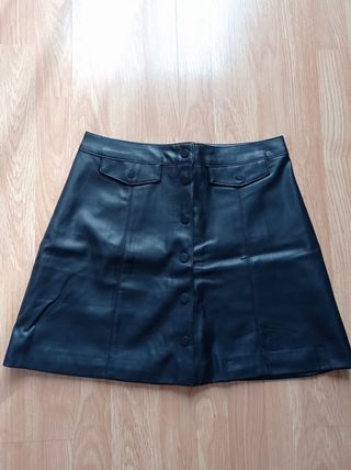 Falda corta de piel con un diseño moderno y elegante. -Cremallera metálica,perfecta. - Material: Piel - Color: Negro - Talla: 40 (L),mide 40 de cintura y 37 de largo.