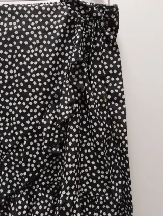 Falda negra con un bonito estampado de flores blancas. Es un modelo cruzado con volantes. - Diseño cruzado. - Detalle de volantes en el borde. - Estampado floral.