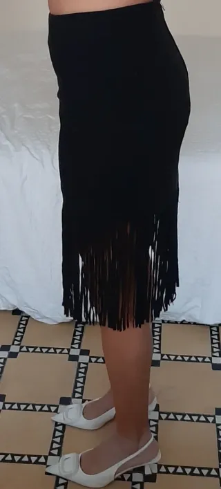 Falda de tela suave que se siente como terciopelo pero no es brillante, es mate. Tiene flecos y llegan sobre la rodilla (mido 1.64)