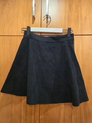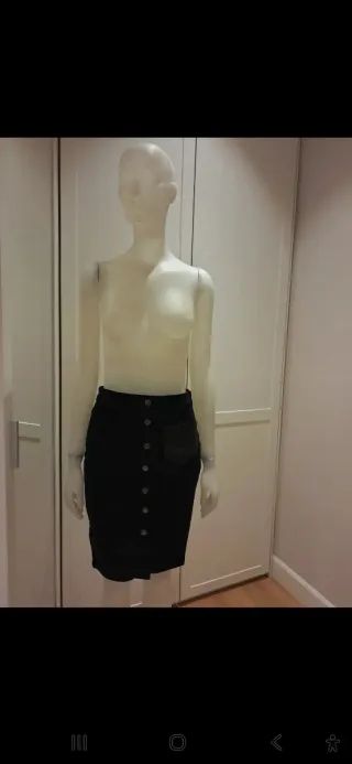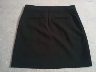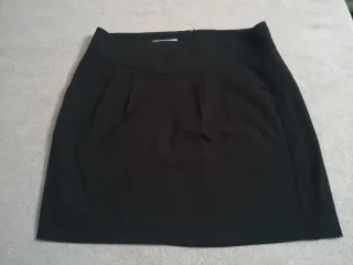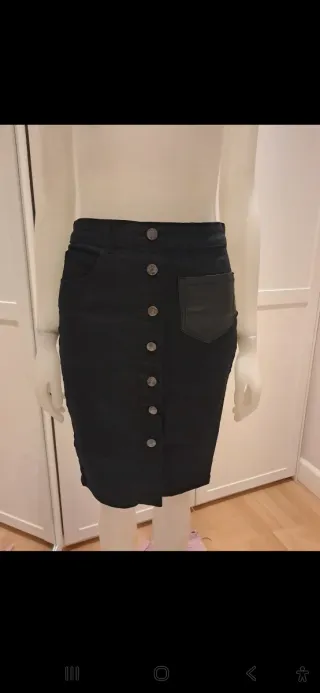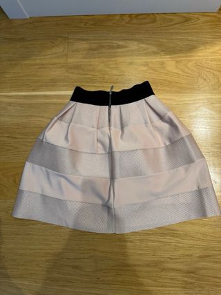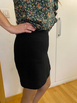 Falda de vestir de la marca Cortefiel. - Diseño liso. - Cintura elástica con detalle de rayas blancas y negras. -Bolsillos laterales y pequeña abertura trasera, también tiene dos bolsillos traseros falsos Se hacen envíos