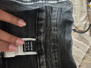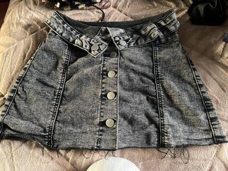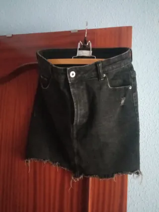Falda vaquera corta con un diseño moderno y detalles de botones. - Estilo desgastado en tonos grises y negros. - Cintura alta. - Cierre de botones frontales. - Bajo deshilachado.