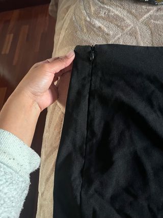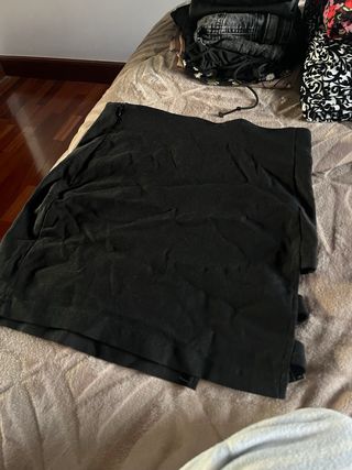 Falda negra de tejido ligero. La propia tela tiene pequeños topos. Tiene goma en la cintura para su ajuste, dos bolsillos y está forrada. Talla M tienes las medidas en las dos últimas fotos.