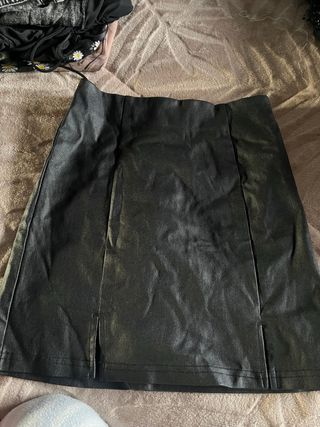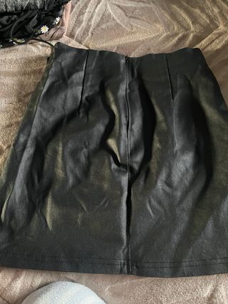 Bonita minifalda de polipiel de la marca Vila. Tiene cremallera por detrás y la cintura en la parte de atrás tiene elástico para ajustarla mejor a cada cuerpo. Corte evasé (no es tubo), tiene vuelito. Las medidas son de cintura 76 (pero recuerda que tiene goma y entonces da más cintura) y de largo 47. Sin estrenar. Está nueva.