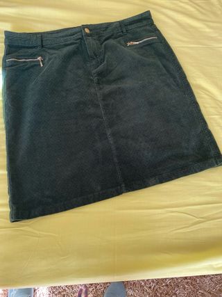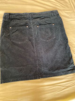 Falda de pana con un discreto estampado de lunares negros. - Diseño de corte recto. - Dos bolsillos delanteros con cremallera dorada. - Cierre de botón y cremallera en la parte frontal. Vale también para la talla 44