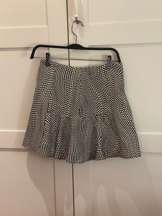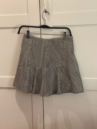 Falda corta con estampado de lunares blancos sobre fondo negro. - Diseño con vuelo. - Cintura alta.