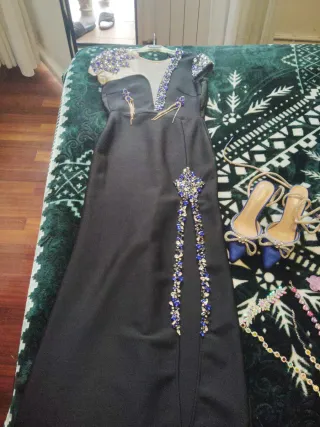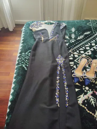 Elegante vestido de fiesta largo con detalles de pedrería. - Diseño con escote pronunciado. - Adornos de pedrería en azul y plateado. - Abertura lateral en la falda.