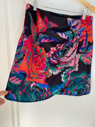 Falda con un bonito estampado floral sobre fondo negro. Su tejido es aterciopelado. Es la S pero va más a la M. - Diseño floral multicolor. - Tejido suave y aterciopelado. - Volante en la parte delantera. - Cremallera lateral .