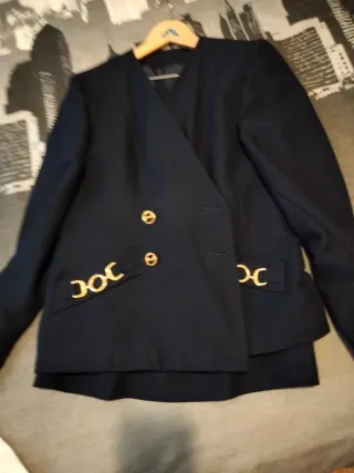 Elegante traje de falda azul marino talla 42. Un conjunto clásico y sofisticado. - Chaqueta cruzada con botones dorados. - Bolsillos delanteros con detalle de cadena dorada. - Falda a juego.