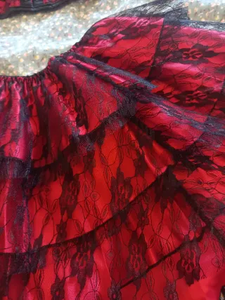 Preciosa falda corta de tul. Color negro y flores rojas. Lleva forro. Gomas en la cintura por lo que se adapta muy bien alcuerpo. Es muy romántica, muy especial y muy versátil. Puede ser dulce con unas bailarinas o muy rockera con unas botas tipo Martens. Talla XL y además da talla. La cintura sin estirar (ten en cuenta que lleva gomas) mide 45 y de largo mide 51. Nunca usada. A estrenar