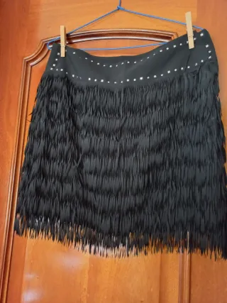 Falda corta con un diseño de flecos y detalles de tachuelas en la cintura. - Flecos largos y abundantes. - Cintura adornada con pequeñas tachuelas plateadas.