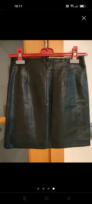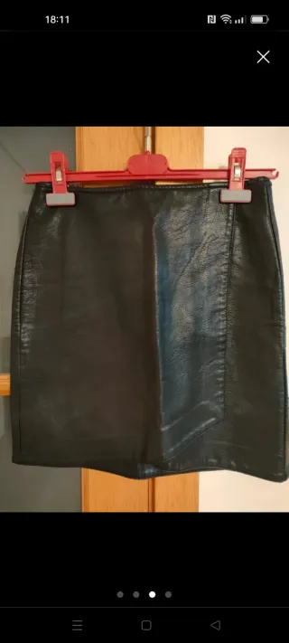 Falda piel sintético negra y pantalón vaquero de corte ajustado. - Minifalda negra de piel sintético marca Stradivarius. - Pantalón vaquero negro de talle alto, cierre de cremallera y botón, tres bolsillos delanteros y dos traseros. Pantalones tipo pitillo, ajustados.