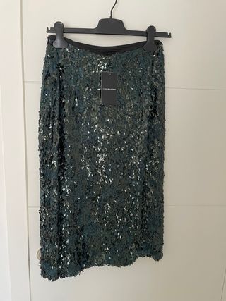Elegante falda midi recta color verde profundo de guipur y lentejuelas. Muy especial, ideal para eventos navideños. no es la típica falda de lentejuela completa, la disposición de las lentejuelas pequeñas y alargadas, permite ver el elegante tejido de guipur interior. perfectamente re forrada en negro. Es talla M pero talla pequeño, como una T.36