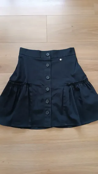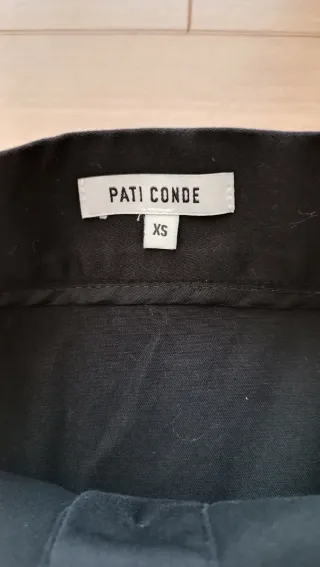 Falda de la marca Pati Conde en color negro. Diseño moderno con botones frontales y detalle de volantes. Talla XS de la marca, equivale a una talla S. Está en perfecto estado. No está descolorida.