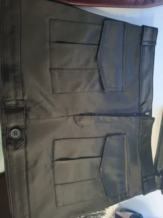 Falda corta de efecto piel, con un acabado brillante y moderno. - Diseño de cinco bolsillos. - Cierre de cremallera y botón. - Costuras visibles.