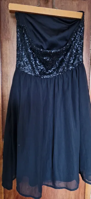 Elegante vestido sin tirantes con detalle de lentejuelas en el corpiño y falda de tul. - Corpiño adornado con lentejuelas. - Falda vaporosa de tul. - Diseño sin tirantes.