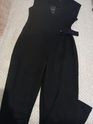 Mono elegante de color negro, con un diseño moderno y favorecedor. - Detalle de cinturón con hebilla. - Escote en V. - Abertura en la falda. - Sin mangas. T s de esfera