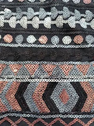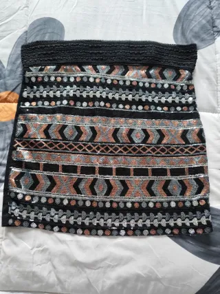 Minifalda con un diseño llamativo de lentejuelas. - Cintura elástica. - Patrones geométricos y de puntos. - Combinación de lentejuelas plateadas, cobrizas y negras.