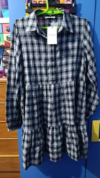 Se vende Vestido de cuadros con diseño de volantes. - Diseño de cuadros en blanco y negro. - Mangas largas. - Cuello camisero. - Cierre de botones. - Volantes en la falda. 12€ está nuevo con su etiqueta !!!hago envíos por Wallapop!!!