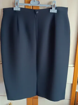 Falda negra de corte recto, altura a la rodilla, cremallera y abertura trasera. Talla 40-42.