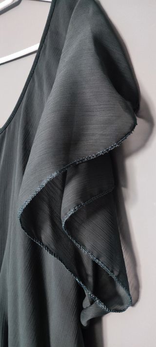 Vestido negro con tirantes finos y escote cruzado. - Diseño con vuelo en la falda. - Acabado con volantes en el bajo.