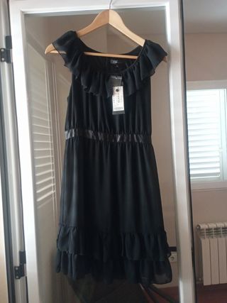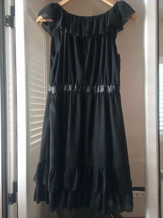 Precioso vestido negro, ideal para cualquier ocasión. Es de talla 36 y tiene un diseño elegante y favorecedor. - Escote de pico con volantes. - Cintura marcada con cinta negra. - Falda con dos niveles de volantes. - Tejido ligero y fluido.