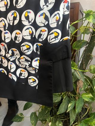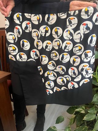 Falda con estampado de tucanes sobre fondo negro. - Diseño circular con tucanes. - Detalle de abertura lateral.