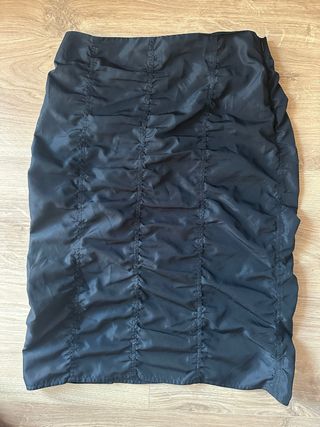 Falda midi de satén color negro, goma en cintura, y lleva un corte en un lateral. Muy buena calidad, da talla para M y L. Nueva con etiqueta.