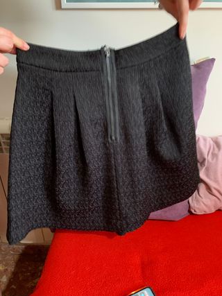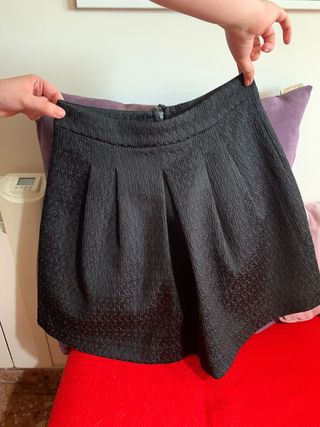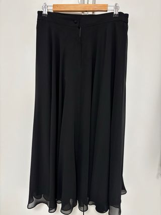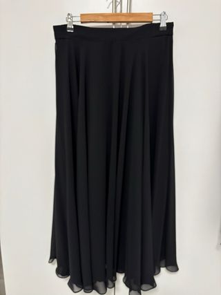 Falda negra, lisa y con un poco de vuelo. Talla M. Tiene forro por debajo de la gasa. Por detrás tiene la cremallera y el botón, y en los laterales de la cintura tiene goma, pero solo un poco en los laterales; se ve en una de la imágenes. No tiene etiqueta pero no se ha usado.