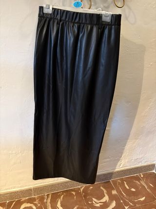 Falda efecto piel de color negro de la tienda Mango. Tiro alto y cremallera de cierre en el lateral. Talla XS, equiparable a una talla S. Como nueva: puesta solo en una ocasión.
