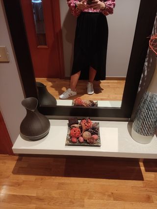 Una Falda 7€ Dos faldas 10€ Las dos con forro Falda larga con un llamativo estampado negro y rojo - Corte amplio y fluido. - Detalle de volantes en el bajo. - cintura elástica talla 46/48 Otra monocolor en rojo Cremallera oculta Con detalles de cintas Talla 46 Nota La aplicación obliga a poner una marca, sino no puedo subirlo