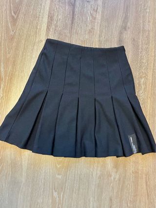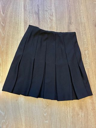 Falda negra, corta y plisada. Talla M. Tiene forro negro por debajo de la parte plisada, por lo tanto, no transparenta. Con goma en la cintura, muy cómoda.