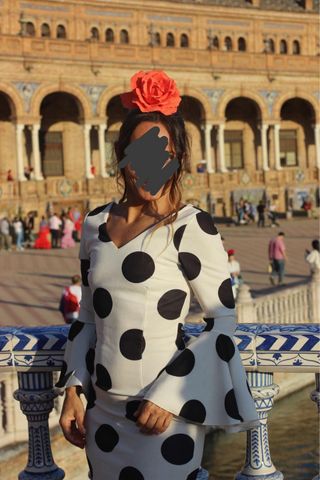 Traje de flamenca con un diseño clásico de lunares. - Diseño de lunares negros sobre fondo blanco. - Mangas acampanadas. - Falda con volantes.