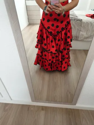 Vestido de flamenca con un diseño clásico y llamativo. - Estampado de lunares negros sobre fondo rojo. -Falda que se puede usar con el corpiño o con un mantón de manila queda súper bonito. - Escote en pico. Esta sacado para una talla 40 aproximadamente, pero como se ve en la foto al ser raso se nota la costura anterior, si lo quisiese alguien más delgada y se le metiese a la costura anterior quedaría nuevamente perfecto