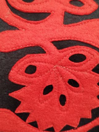 Pieza de fieltro negra y rojo. Interesante para bajo falda. 70x30 sin contar el fleco. En perfecto estado. Limpio de tintorería.