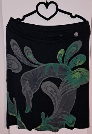Falda de algodón elástica Smash, queda por la rodilla. Doble estampado, por la parte de atrás bordada, colores negro, verde y gris. Talla L. Usada un par de veces.