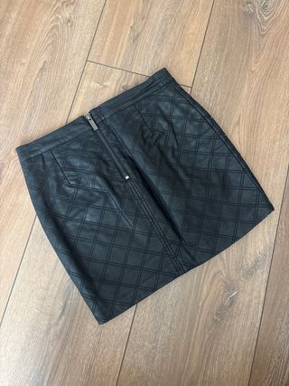 Elegante mini falda de cuero sintético con un diseño acolchado en rombos y adornada con pequeñas tachuelas plateadas. - Diseño acolchado. - Tachuelas decorativas. -Efecto piel bueno. -Sin usar