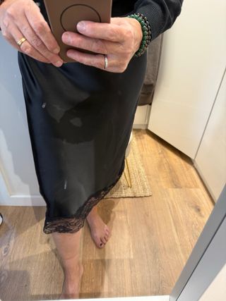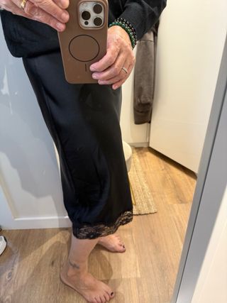 Falda elegante de Primark con detalle de encaje en el bajo. - Color negro. - Talla S. - Tejido satinado.