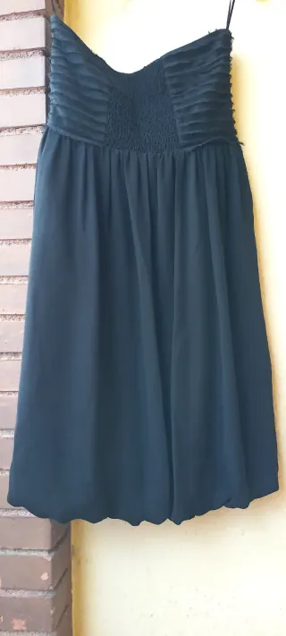 Elegante vestido de fiesta de Zara, ideal para ocasiones especiales. Confeccionado en seda y adornado con detalles brillantes. - Diseño con tirantes finos. - Cuerpo con pequeños plisados y pedrería. - Falda escalonada con volantes. - Adorno de lazo lateral.