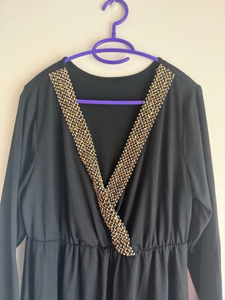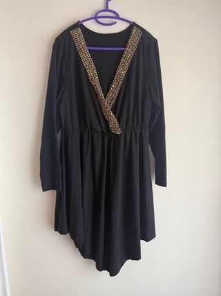 Elegante vestido negro con un diseño cruzado en el escote adornado con detalles dorados. - Escote cruzado con pedrería dorada. - Cintura elástica. - Falda con corte asimétrico. - Da talla desde la 44 hasta la 46 más o menos