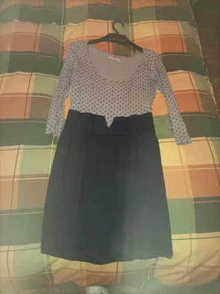 Vestido de manga larga con un diseño de lunares. - Parte superior gris con estampado de puntos negros. - Falda negra. - Cuello redondo.