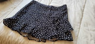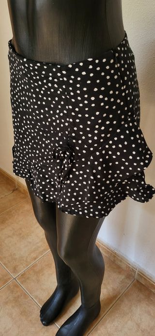 mini Falda corta con estampado de lunares blancos sobre fondo negro. Presenta un diseño cruzado con volante y detalle de lazo. por dentro lleva una braguita tipo pantalon - Estampado de lunares. - Volante en el bajo. - Cierre con lazo. muy poco uso