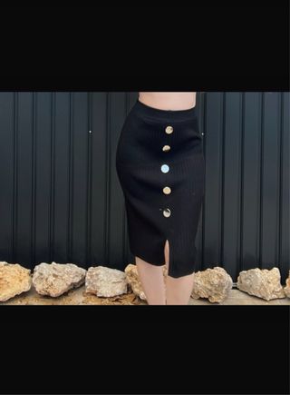 Preciosa falda midi negra de punto. Es elegante y cómoda a la vez. - Diseño de canalé. - Botones plateados decorativos en la parte delantera. - Abertura en la parte inferior. - Tiene un pequwño desperfecto quw de ha formado una linea mas clara.