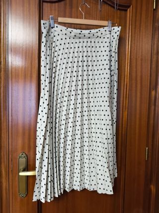 Preciosa falda midi plisada de Cortefiel. Es de color beige con lunares negros. Luce impecable. - Diseño elegante y atemporal. - Tejido fluido y ligero. - Perfecta para cualquier ocasión.