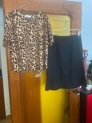 Conjunto de falda y blusa. La blusa es de color negro y tiene un corte amplio y cómodo. La falda es de estampado animal print en tonos marrones y negros. Ambas prendas están en buen estado. - Blusa de manga corta. - Falda de tiro alto. inturilla elastica, una pieza 7€. y las dos 10€.
