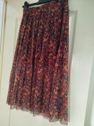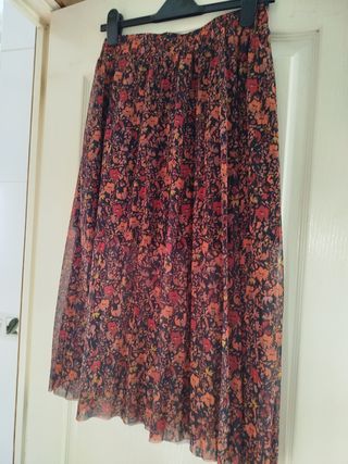 Preciosa falda midi plisada con estampado floral. Ideal para cualquier ocasión. - Talla S/M(tiene goma) - Color negro, rojo y naranja - Tejido ligero y fluido -Forro negro por encima de las rodillas y es tipo gasa
