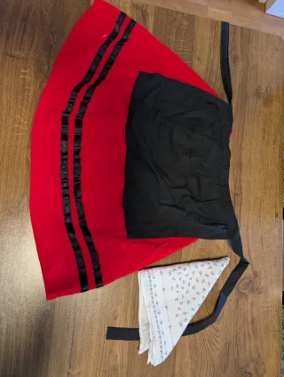 Falda pañuelo y delantal, hecha a mano, ideal para Olentzero. Talla entre 7 y 8 años. Tres prendas. - Diseño casero. Baserritarra - Combinación de colores rojo y negro. No recomiendo soltar el dobladillo.